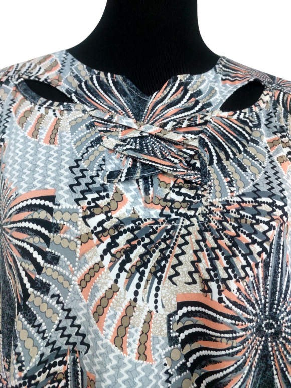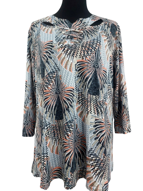 Relaxed T-Shirt - No Collar, Round neckline, Regular shoulder, Plain Three quarter sleeve - Gray, XL