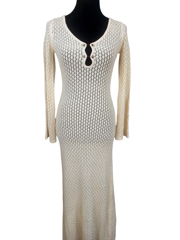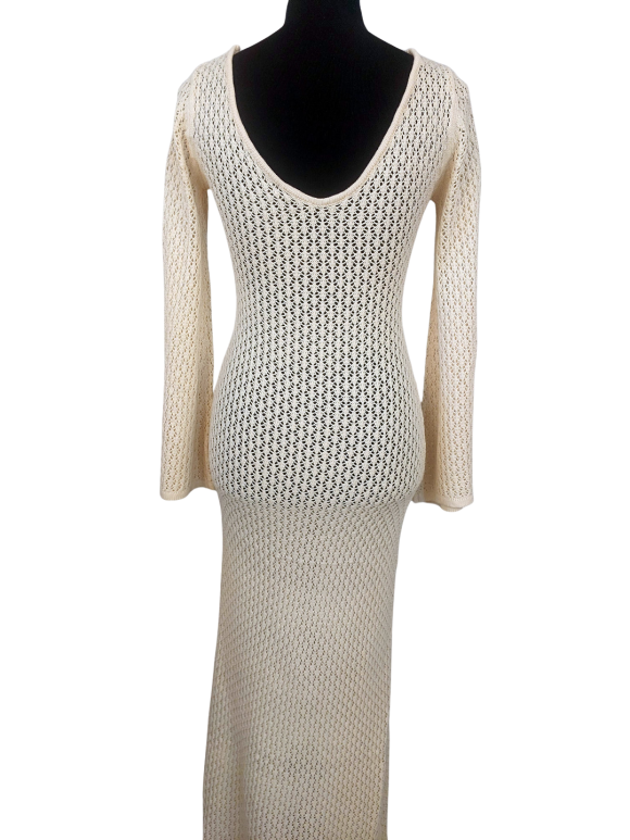 فستان ضيق (Sheath) - خط عنق شكل ـ V ـ، بدون ياقة، كتف عادي، أكمام طويلة بشكل جرس (Bell) - عاجي - S