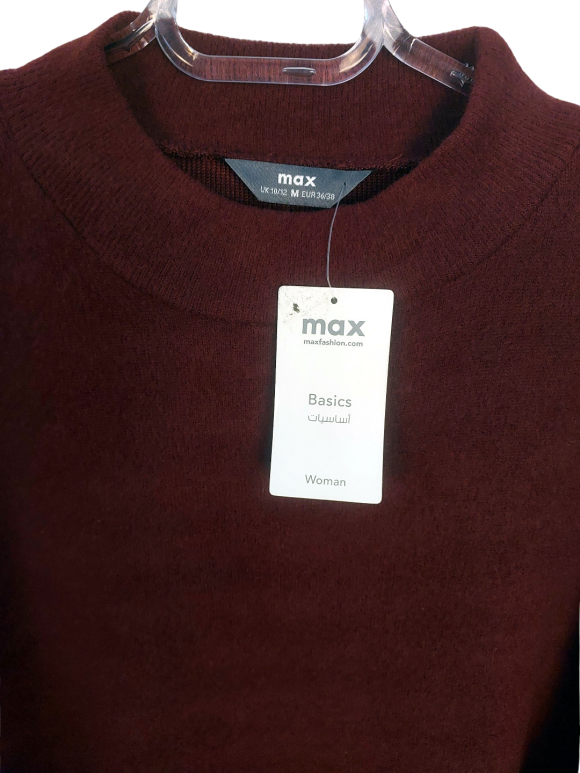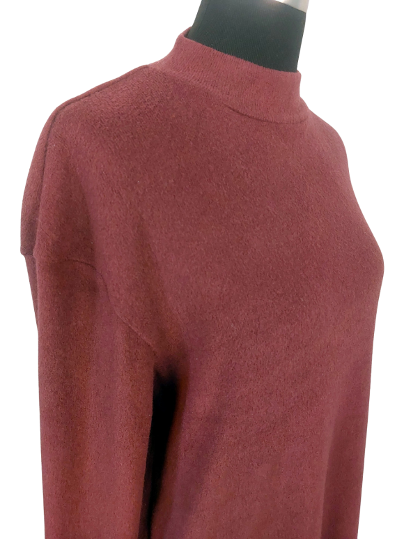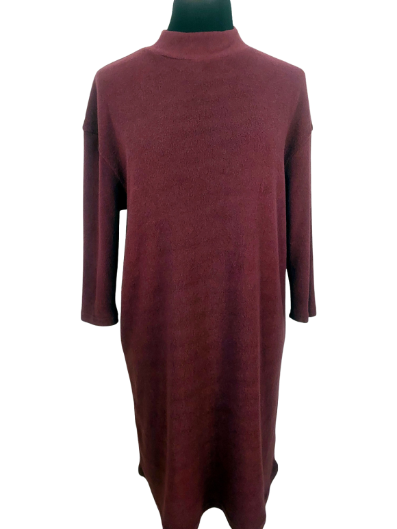 Tunic Dress - No Collar, Round neckline, Regular shoulder, Plain Three quarter sleeve - Burgundy - M