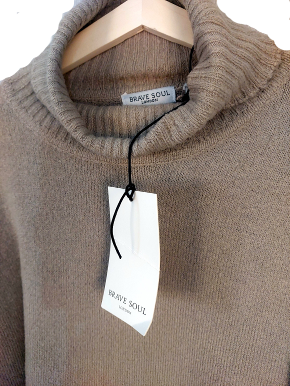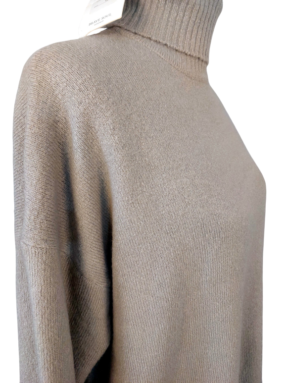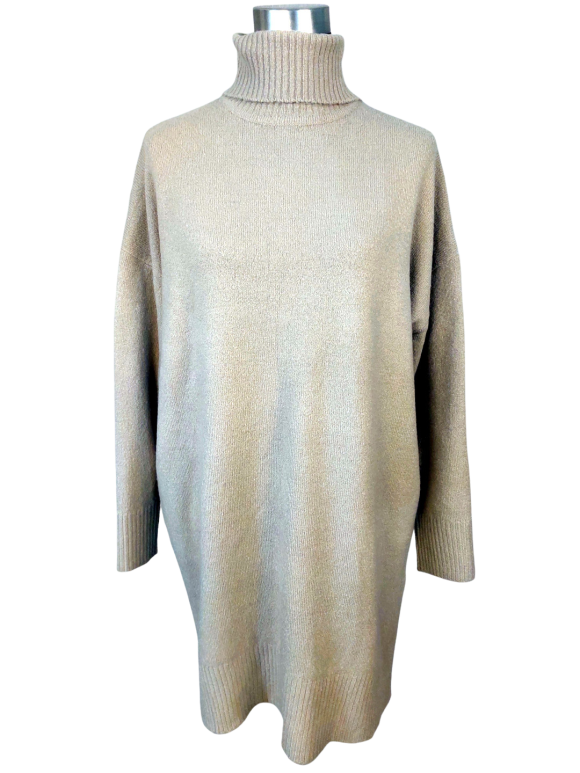 Tunic Dress - No Collar, Turtleneck neckline, Regular shoulder, Plain Long sleeve - Tan - L/XL
