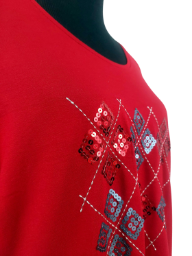 Relaxed T-Shirt - No Collar, V-Shape neckline, Regular shoulder, Bell Three quarter sleeve - Red, M